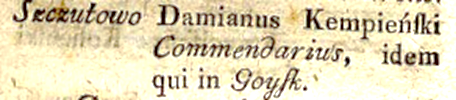 Biskup Płocki Michał Jerzy Poniatowski w „Rozporządzeniach y pismach pasterskich …” [1], przy Parafii w Gójsku i w Szczutowie wymienia nazwisko Damiana Kępieńskiego kaznodzieję zakonu, tymczasowego zarządcę używając słów” „Ord: Pradi:” o zapewne skrót ten odnosi się do słów Ordinis Pradikator – Kaznodzieja Zakonu i słowa „Commendarius”[2] – tymczasowy zarządca, administrator parafii.